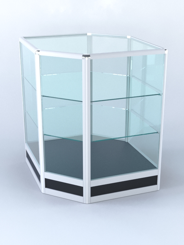 Прилавок из профиля угловой шестигранный №4 (открытый) изготавливается из алюминиевого профиля с использованием заполнителей из МДФ и стекла. Высота подиума прилавка — 15 см от пола. Прилавок комплектуется двумя стеклянными полками, которые можно регулировать по высоте. Все размеры, а также комплектация, могут быть изменены по желанию заказчика. Возможно добавление полок. Цвет подбирается в вариантах стандарт и на заказ.