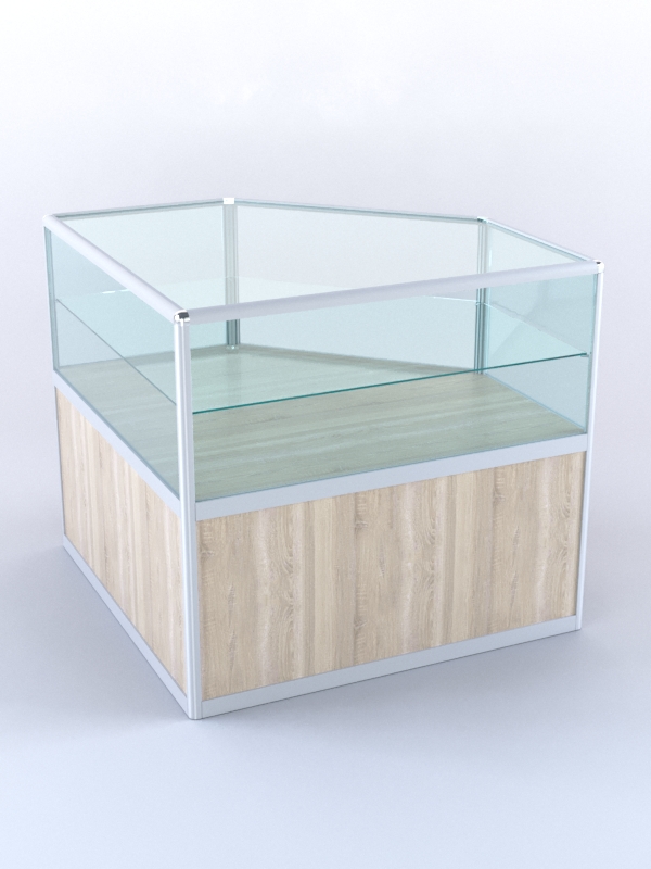 Прилавок из профиля угловой пятигранный №3 (открытый) изготавливается из алюминиевого профиля с использованием заполнителей из МДФ и стекла. Верхняя половина прилавка — прозрачная. Прилавок комплектуется одной стеклянной полкой, которую можно регулировать по высоте. Все размеры, а также комплектация, могут быть изменены по желанию заказчика. Возможно добавление полок. Цвет подбирается в вариантах стандарт и на заказ.