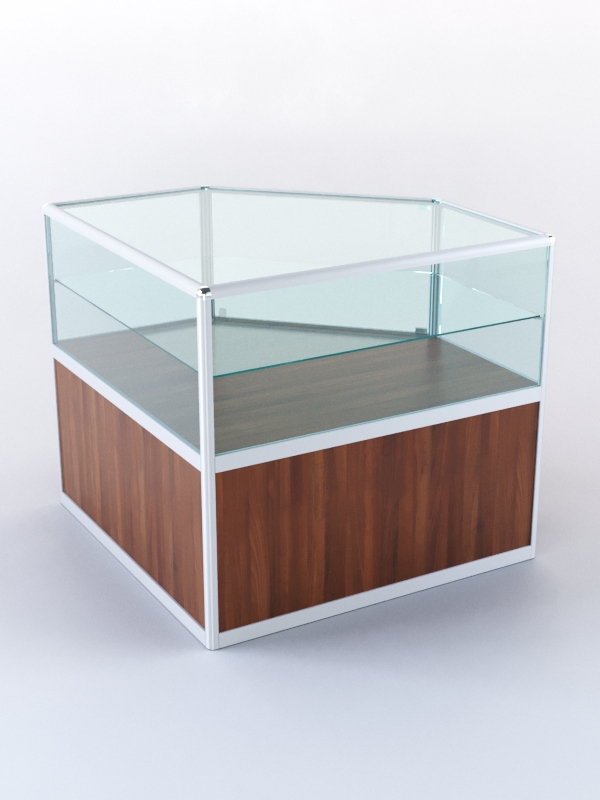 Прилавок из профиля угловой пятигранный №3 (закрытый) изготавливается из алюминиевого профиля с использованием заполнителей из МДФ и стекла. Верхняя половина прилавка — прозрачная, с распашной стеклянной дверью и замком. Накопитель прилавка закрыт распашной дверью из МДФ с замком. Прилавок комплектуется одной стеклянной полкой, которую можно регулировать по высоте. Все размеры, а также комплектация, могут быть изменены по желанию заказчика. Возможно добавление полок. Цвет подбирается в вариантах стандарт и на заказ.