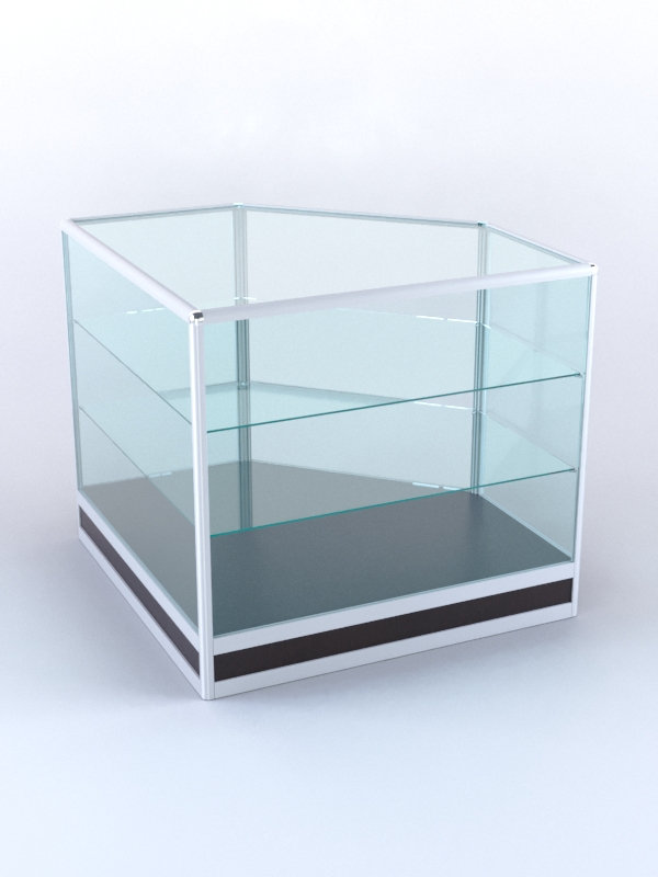 Прилавок из профиля угловой пятигранный №4 (открытый) изготавливается из алюминиевого профиля с использованием заполнителей из МДФ и стекла. Высота подиума прилавка — 15 см от пола. Прилавок комплектуется двумя стеклянными полками, которые можно регулировать по высоте. Все размеры, а также комплектация, могут быть изменены по желанию заказчика. Возможно добавление полок. Цвет подбирается в вариантах стандарт и на заказ.