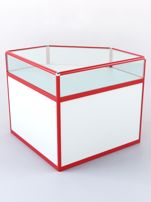 Прилавок из профиля угловой пятигранный №2 (закрытый) изготавливается из алюминиевого профиля с использованием заполнителей из МДФ и стекла. Верхняя часть прилавка — прозрачная, с распашной стеклянной дверцой и замком. Накопитель прилавка закрыт распашной дверцой из МДФ с замком. Все размеры, а также комплектация, могут быть изменены по желанию заказчика. Возможно добавление полок. Цвет подбирается в вариантах стандарт и на заказ.