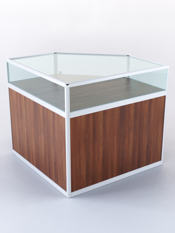 Прилавок из профиля угловой пятигранный №2 (закрытый) изготавливается из алюминиевого профиля с использованием заполнителей из МДФ и стекла. Верхняя часть прилавка — прозрачная, с распашной стеклянной дверцой и замком. Накопитель прилавка закрыт распашной дверцой из МДФ с замком. Все размеры, а также комплектация, могут быть изменены по желанию заказчика. Возможно добавление полок. Цвет подбирается в вариантах стандарт и на заказ.