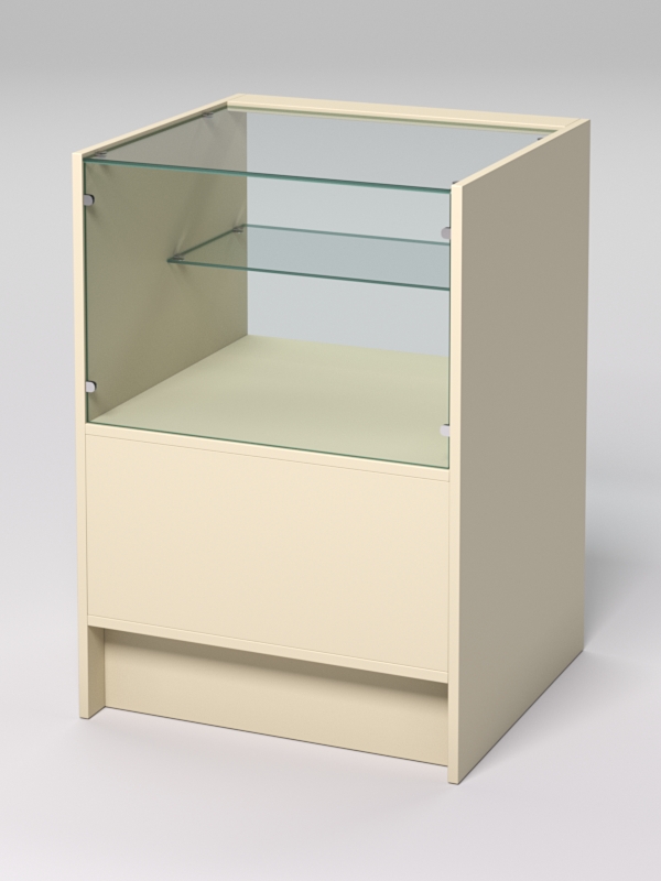 Изделие оснащено внутри двумя полками, где можно разместить товар для демонстрации. Верхняя полка из стекла, нижняя полка из ЛДСП. Под нижней полкой из ЛДСП имеется пространство, которое можно использовать для размещения запасного товара, готовых заказов, предметов связанных с работой или личные вещи сотрудников.
