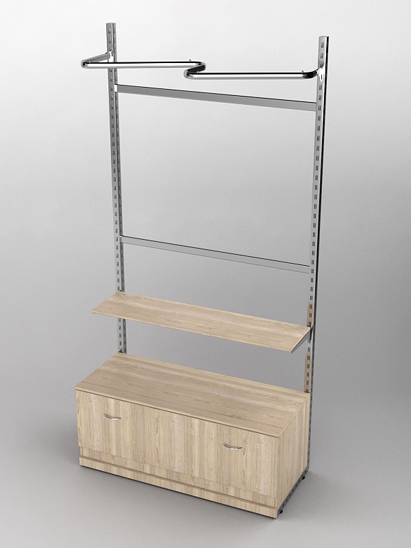 Система «Элегант» — представляет собой стальные перфорированные L-образные стойки длиной 2400мм, сечением трубы 38х38мм с фурнитурой. Стойки скрепляются между собой через определенные расстояния металлическими стяжками. Специализированная фурнитура представляет собой крючки, кронштейны, поручни и полкодержатели, которые вставляются в пазы стоек. Высота и ширина текущей конструкции может быть уменьшена, либо увеличена по желанию заказчика. Также возможен вариант размещения зеркальных или ЛДСП панелей, или экономпанелей между стойками, что позволит придать помещению эксклюзивный вид.