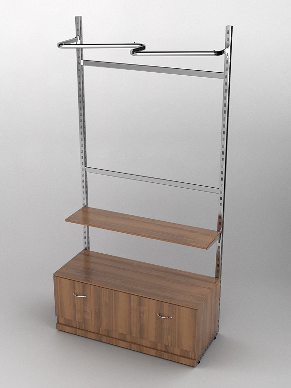 Система «Элегант» — представляет собой стальные перфорированные L-образные стойки длиной 2400мм, сечением трубы 38х38мм с фурнитурой. Стойки скрепляются между собой через определенные расстояния металлическими стяжками. Специализированная фурнитура представляет собой крючки, кронштейны, поручни и полкодержатели, которые вставляются в пазы стоек. Высота и ширина текущей конструкции может быть уменьшена, либо увеличена по желанию заказчика. Также возможен вариант размещения зеркальных или ЛДСП панелей, или экономпанелей между стойками, что позволит придать помещению эксклюзивный вид.