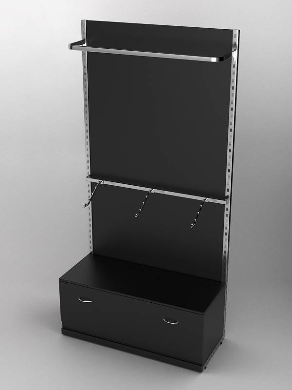 Система «Элегант» — представляет собой стальные перфорированные L-образные стойки длиной 2400мм, сечением трубы 38х38мм с фурнитурой. Стойки скрепляются между собой через определенные расстояния металлическими стяжками. Специализированная фурнитура представляет собой крючки, кронштейны, поручни и полкодержатели, которые вставляются в пазы стоек. Высота и ширина текущей конструкции может быть уменьшена, либо увеличена по желанию заказчика. Также возможен вариант размещения зеркальных или ЛДСП панелей, или экономпанелей между стойками, что позволит придать помещению эксклюзивный вид.