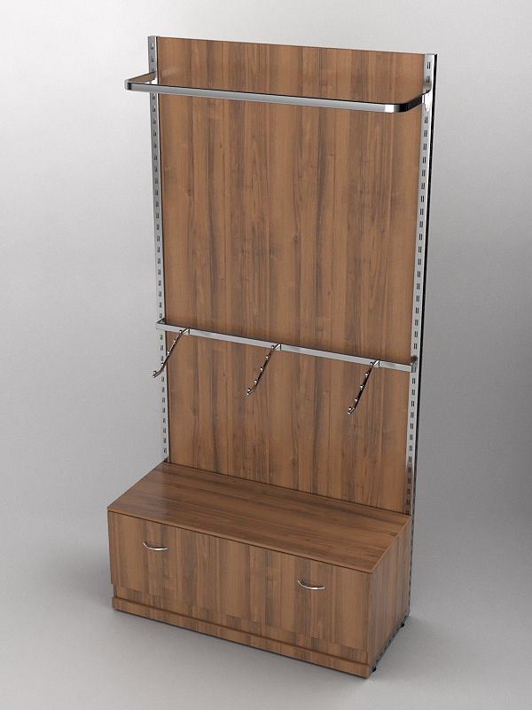 Система «Элегант» — представляет собой стальные перфорированные L-образные стойки длиной 2400мм, сечением трубы 38х38мм с фурнитурой. Стойки скрепляются между собой через определенные расстояния металлическими стяжками. Специализированная фурнитура представляет собой крючки, кронштейны, поручни и полкодержатели, которые вставляются в пазы стоек. Высота и ширина текущей конструкции может быть уменьшена, либо увеличена по желанию заказчика. Также возможен вариант размещения зеркальных или ЛДСП панелей, или экономпанелей между стойками, что позволит придать помещению эксклюзивный вид.
