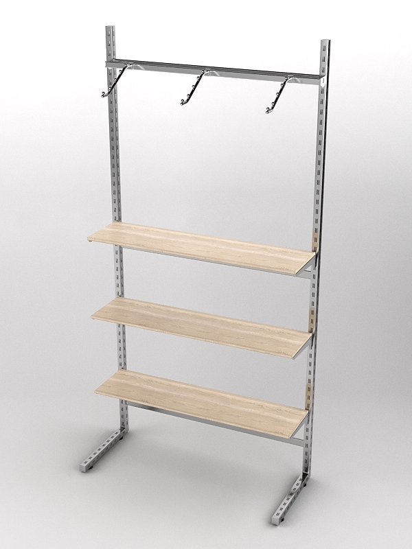 Система «Элегант» — представляет собой стальные перфорированные L-образные стойки длиной 2400мм, сечением трубы 38х38мм с фурнитурой. Стойки скрепляются между собой через определенные расстояния металлическими стяжками. Специализированная фурнитура представляет собой крючки, кронштейны, поручни и полкодержатели, которые вставляются в пазы стоек. Высота и ширина текущей конструкции может быть уменьшена, либо увеличена по желанию заказчика. Также возможен вариант размещения зеркальных или ЛДСП панелей, или экономпанелей между стойками, что позволит придать помещению эксклюзивный вид.