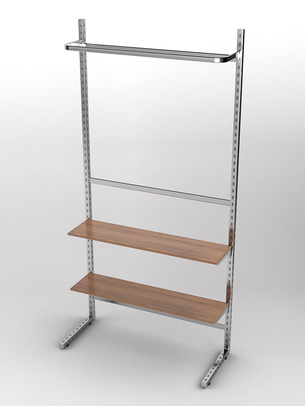 Система «Элегант» — представляет собой стальные перфорированные L-образные стойки длиной 2400мм, сечением трубы 38х38мм с фурнитурой. Стойки скрепляются между собой через определенные расстояния металлическими стяжками. Специализированная фурнитура представляет собой крючки, кронштейны, поручни и полкодержатели, которые вставляются в пазы стоек. Высота и ширина текущей конструкции может быть уменьшена, либо увеличена по желанию заказчика. Также возможен вариант размещения зеркальных или ЛДСП панелей, или экономпанелей между стойками, что позволит придать помещению эксклюзивный вид.