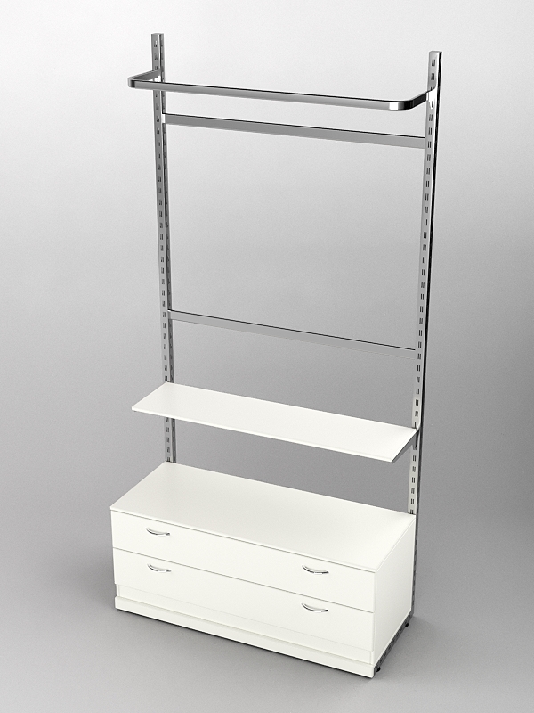 Система «Элегант» — представляет собой стальные перфорированные L-образные стойки длиной 2400мм, сечением трубы 38х38мм с фурнитурой. Стойки скрепляются между собой через определенные расстояния металлическими стяжками. Специализированная фурнитура представляет собой крючки, кронштейны, поручни и полкодержатели, которые вставляются в пазы стоек. Высота и ширина текущей конструкции может быть уменьшена, либо увеличена по желанию заказчика. Также возможен вариант размещения зеркальных или ЛДСП панелей, или экономпанелей между стойками, что позволит придать помещению эксклюзивный вид.