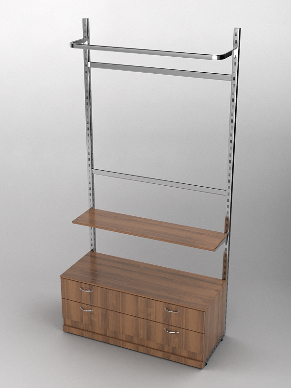 Система «Элегант» — представляет собой стальные перфорированные L-образные стойки длиной 2400мм, сечением трубы 38х38мм с фурнитурой. Стойки скрепляются между собой через определенные расстояния металлическими стяжками. Специализированная фурнитура представляет собой крючки, кронштейны, поручни и полкодержатели, которые вставляются в пазы стоек. Высота и ширина текущей конструкции может быть уменьшена, либо увеличена по желанию заказчика. Также возможен вариант размещения зеркальных или ЛДСП панелей, или экономпанелей между стойками, что позволит придать помещению эксклюзивный вид.