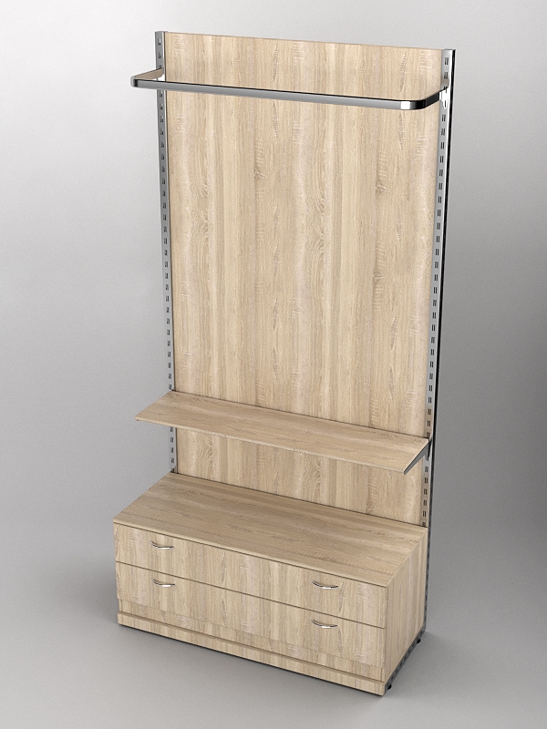 Система «Элегант» — представляет собой стальные перфорированные L-образные стойки длиной 2400мм, сечением трубы 38х38мм с фурнитурой. Стойки скрепляются между собой через определенные расстояния металлическими стяжками. Специализированная фурнитура представляет собой крючки, кронштейны, поручни и полкодержатели, которые вставляются в пазы стоек. Высота и ширина текущей конструкции может быть уменьшена, либо увеличена по желанию заказчика. Также возможен вариант размещения зеркальных или ЛДСП панелей, или экономпанелей между стойками, что позволит придать помещению эксклюзивный вид.