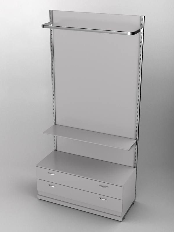 Система «Элегант» — представляет собой стальные перфорированные L-образные стойки длиной 2400мм, сечением трубы 38х38мм с фурнитурой. Стойки скрепляются между собой через определенные расстояния металлическими стяжками. Специализированная фурнитура представляет собой крючки, кронштейны, поручни и полкодержатели, которые вставляются в пазы стоек. Высота и ширина текущей конструкции может быть уменьшена, либо увеличена по желанию заказчика. Также возможен вариант размещения зеркальных или ЛДСП панелей, или экономпанелей между стойками, что позволит придать помещению эксклюзивный вид.