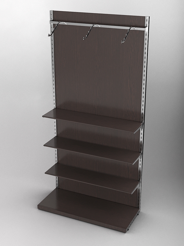Система «Элегант» — представляет собой стальные перфорированные L-образные стойки длиной 2400мм, сечением трубы 38х38мм с фурнитурой. Стойки скрепляются между собой через определенные расстояния металлическими стяжками. Специализированная фурнитура представляет собой крючки, кронштейны, поручни и полкодержатели, которые вставляются в пазы стоек. Высота и ширина текущей конструкции может быть уменьшена, либо увеличена по желанию заказчика. Также возможен вариант размещения зеркальных или ЛДСП панелей, или экономпанелей между стойками, что позволит придать помещению эксклюзивный вид.