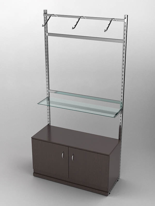 Система «Элегант» — представляет собой стальные перфорированные L-образные стойки длиной 2400мм, сечением трубы 38х38мм с фурнитурой. Стойки скрепляются между собой через определенные расстояния металлическими стяжками. Специализированная фурнитура представляет собой крючки, кронштейны, поручни и полкодержатели, которые вставляются в пазы стоек. Высота и ширина текущей конструкции может быть уменьшена, либо увеличена по желанию заказчика. Также возможен вариант размещения зеркальных или ЛДСП панелей, или экономпанелей между стойками, что позволит придать помещению эксклюзивный вид.