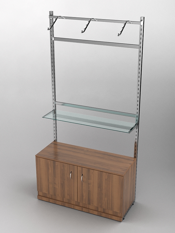 Система «Элегант» — представляет собой стальные перфорированные L-образные стойки длиной 2400мм, сечением трубы 38х38мм с фурнитурой. Стойки скрепляются между собой через определенные расстояния металлическими стяжками. Специализированная фурнитура представляет собой крючки, кронштейны, поручни и полкодержатели, которые вставляются в пазы стоек. Высота и ширина текущей конструкции может быть уменьшена, либо увеличена по желанию заказчика. Также возможен вариант размещения зеркальных или ЛДСП панелей, или экономпанелей между стойками, что позволит придать помещению эксклюзивный вид.
