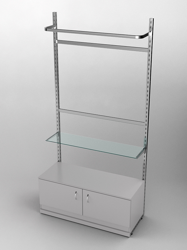 Система «Элегант» — представляет собой стальные перфорированные L-образные стойки длиной 2400мм, сечением трубы 38х38мм с фурнитурой. Стойки скрепляются между собой через определенные расстояния металлическими стяжками. Специализированная фурнитура представляет собой крючки, кронштейны, поручни и полкодержатели, которые вставляются в пазы стоек. Высота и ширина текущей конструкции может быть уменьшена, либо увеличена по желанию заказчика. Также возможен вариант размещения зеркальных или ЛДСП панелей, или экономпанелей между стойками, что позволит придать помещению эксклюзивный вид.