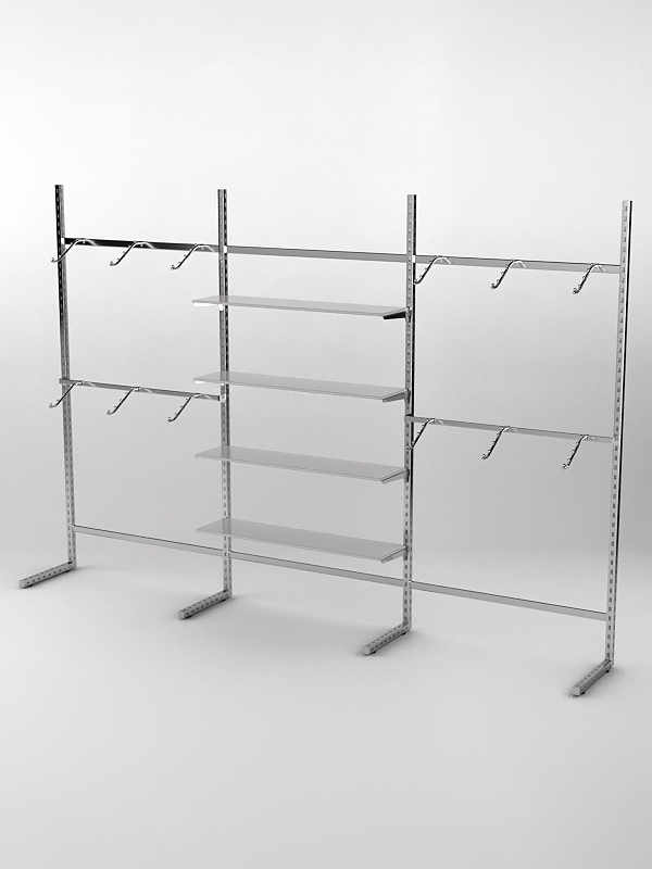 Система «Элегант» — представляет собой стальные перфорированные L-образные стойки длиной 2400мм, сечением трубы 38х38мм с фурнитурой. Стойки скрепляются между собой через определенные расстояния металлическими стяжками. Специализированная фурнитура представляет собой крючки, кронштейны, поручни и полкодержатели, которые вставляются в пазы стоек. Высота и ширина текущей конструкции может быть уменьшена, либо увеличена по желанию заказчика. Также возможен вариант размещения зеркальных или ЛДСП панелей, или экономпанелей между стойками, что позволит придать помещению эксклюзивный вид.