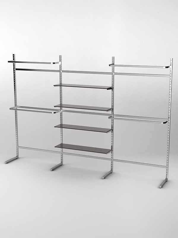 Система «Элегант» — представляет собой стальные перфорированные L-образные стойки длиной 2400мм, сечением трубы 38х38мм с фурнитурой. Стойки скрепляются между собой через определенные расстояния металлическими стяжками. Специализированная фурнитура представляет собой крючки, кронштейны, поручни и полкодержатели, которые вставляются в пазы стоек. Высота и ширина текущей конструкции может быть уменьшена, либо увеличена по желанию заказчика. Также возможен вариант размещения зеркальных или ЛДСП панелей, или экономпанелей между стойками, что позволит придать помещению эксклюзивный вид.