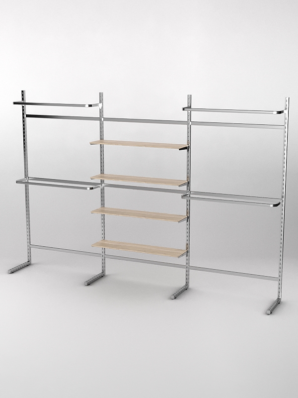 Система «Элегант» — представляет собой стальные перфорированные L-образные стойки длиной 2400мм, сечением трубы 38х38мм с фурнитурой. Стойки скрепляются между собой через определенные расстояния металлическими стяжками. Специализированная фурнитура представляет собой крючки, кронштейны, поручни и полкодержатели, которые вставляются в пазы стоек. Высота и ширина текущей конструкции может быть уменьшена, либо увеличена по желанию заказчика. Также возможен вариант размещения зеркальных или ЛДСП панелей, или экономпанелей между стойками, что позволит придать помещению эксклюзивный вид.