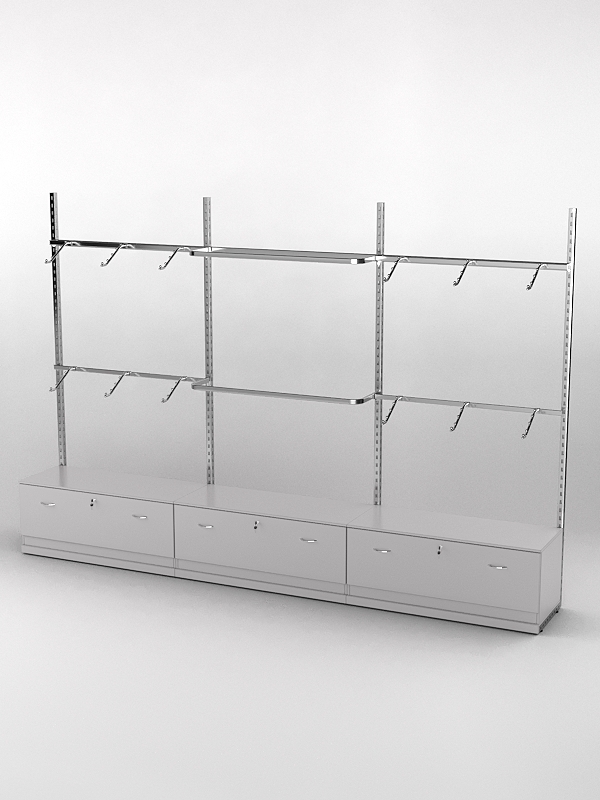 Система «Элегант» — представляет собой стальные перфорированные L-образные стойки длиной 2400мм, сечением трубы 38х38мм с фурнитурой. Стойки скрепляются между собой через определенные расстояния металлическими стяжками. Специализированная фурнитура представляет собой крючки, кронштейны, поручни и полкодержатели, которые вставляются в пазы стоек. Высота и ширина текущей конструкции может быть уменьшена, либо увеличена по желанию заказчика. Также возможен вариант размещения зеркальных или ЛДСП панелей, или экономпанелей между стойками, что позволит придать помещению эксклюзивный вид.