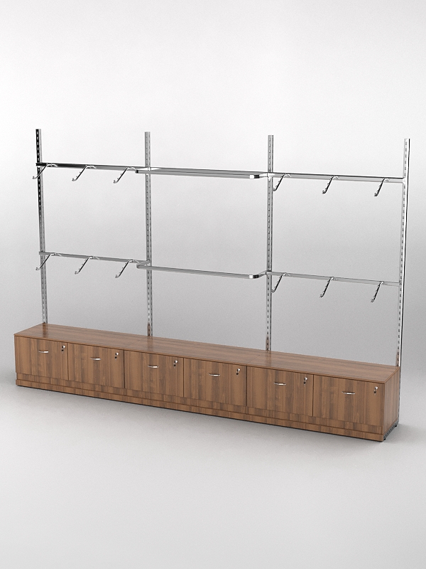 Система «Элегант» — представляет собой стальные перфорированные L-образные стойки длиной 2400мм, сечением трубы 38х38мм с фурнитурой. Стойки скрепляются между собой через определенные расстояния металлическими стяжками. Специализированная фурнитура представляет собой крючки, кронштейны, поручни и полкодержатели, которые вставляются в пазы стоек. Высота и ширина текущей конструкции может быть уменьшена, либо увеличена по желанию заказчика. Также возможен вариант размещения зеркальных или ЛДСП панелей, или экономпанелей между стойками, что позволит придать помещению эксклюзивный вид.