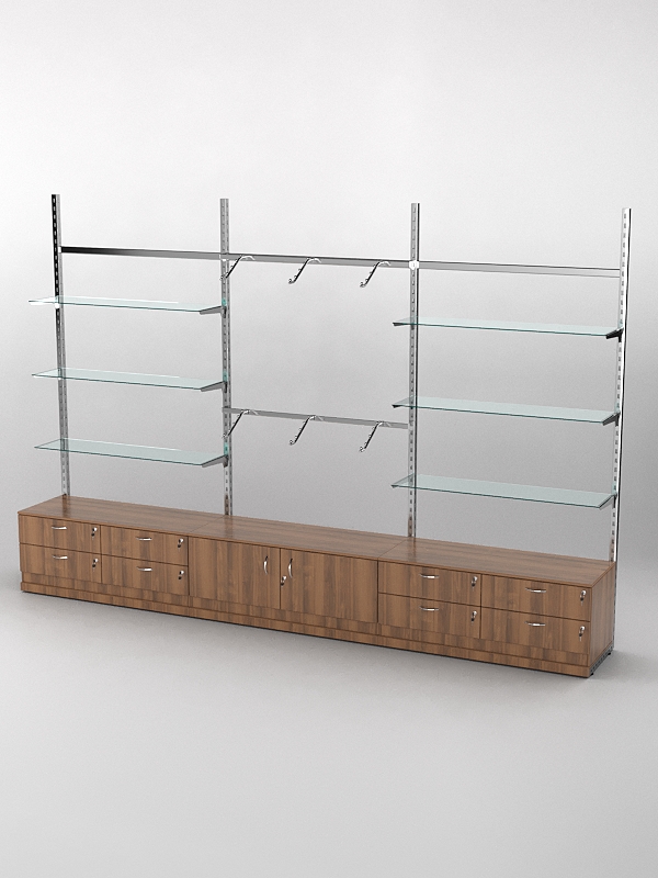 Система «Элегант» — представляет собой стальные перфорированные L-образные стойки длиной 2400мм, сечением трубы 38х38мм с фурнитурой. Стойки скрепляются между собой через определенные расстояния металлическими стяжками. Специализированная фурнитура представляет собой крючки, кронштейны, поручни и полкодержатели, которые вставляются в пазы стоек. Высота и ширина текущей конструкции может быть уменьшена, либо увеличена по желанию заказчика. Также возможен вариант размещения зеркальных или ЛДСП панелей, или экономпанелей между стойками, что позволит придать помещению эксклюзивный вид.
