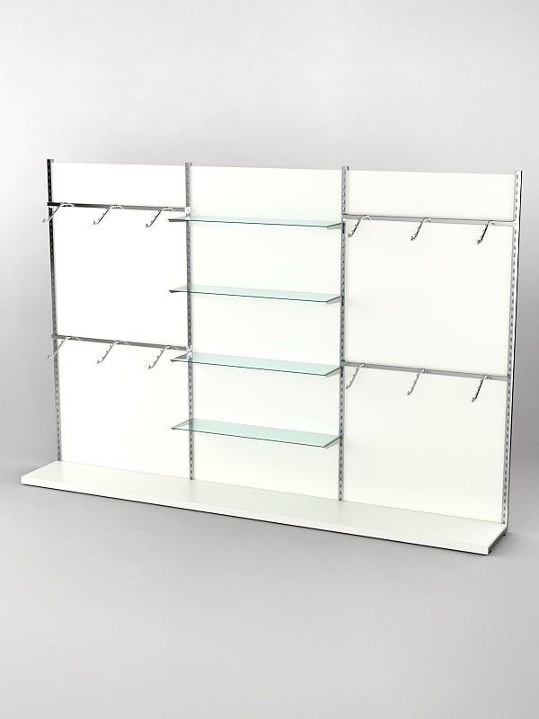 Система «Элегант» — представляет собой стальные перфорированные L-образные стойки длиной 2400мм, сечением трубы 38х38мм с фурнитурой. Стойки скрепляются между собой через определенные расстояния металлическими стяжками. Специализированная фурнитура представляет собой крючки, кронштейны, поручни и полкодержатели, которые вставляются в пазы стоек. Высота и ширина текущей конструкции может быть уменьшена, либо увеличена по желанию заказчика. Также возможен вариант размещения зеркальных или ЛДСП панелей, или экономпанелей между стойками, что позволит придать помещению эксклюзивный вид.