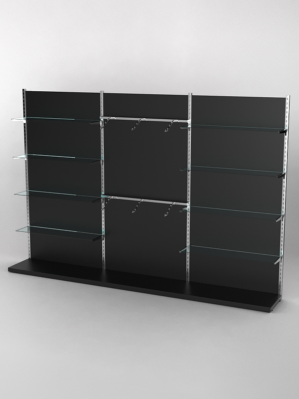 Система «Элегант» — представляет собой стальные перфорированные L-образные стойки длиной 2400мм, сечением трубы 38х38мм с фурнитурой. Стойки скрепляются между собой через определенные расстояния металлическими стяжками. Специализированная фурнитура представляет собой крючки, кронштейны, поручни и полкодержатели, которые вставляются в пазы стоек. Высота и ширина текущей конструкции может быть уменьшена, либо увеличена по желанию заказчика. Также возможен вариант размещения зеркальных или ЛДСП панелей, или экономпанелей между стойками, что позволит придать помещению эксклюзивный вид.