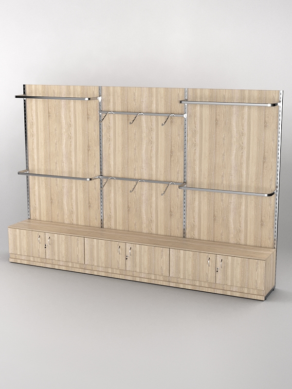 Система «Элегант» — представляет собой стальные перфорированные L-образные стойки длиной 2400мм, сечением трубы 38х38мм с фурнитурой. Стойки скрепляются между собой через определенные расстояния металлическими стяжками. Специализированная фурнитура представляет собой крючки, кронштейны, поручни и полкодержатели, которые вставляются в пазы стоек. Высота и ширина текущей конструкции может быть уменьшена, либо увеличена по желанию заказчика. Также возможен вариант размещения зеркальных или ЛДСП панелей, или экономпанелей между стойками, что позволит придать помещению эксклюзивный вид.