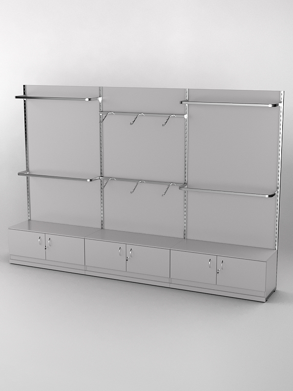 Система «Элегант» — представляет собой стальные перфорированные L-образные стойки длиной 2400мм, сечением трубы 38х38мм с фурнитурой. Стойки скрепляются между собой через определенные расстояния металлическими стяжками. Специализированная фурнитура представляет собой крючки, кронштейны, поручни и полкодержатели, которые вставляются в пазы стоек. Высота и ширина текущей конструкции может быть уменьшена, либо увеличена по желанию заказчика. Также возможен вариант размещения зеркальных или ЛДСП панелей, или экономпанелей между стойками, что позволит придать помещению эксклюзивный вид.