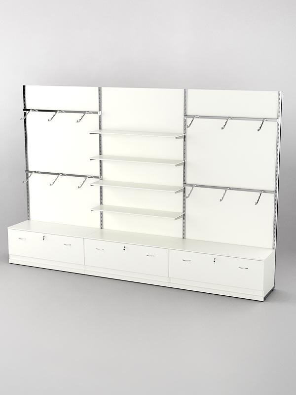 Система «Элегант» — представляет собой стальные перфорированные L-образные стойки длиной 2400мм, сечением трубы 38х38мм с фурнитурой. Стойки скрепляются между собой через определенные расстояния металлическими стяжками. Специализированная фурнитура представляет собой крючки, кронштейны, поручни и полкодержатели, которые вставляются в пазы стоек. Высота и ширина текущей конструкции может быть уменьшена, либо увеличена по желанию заказчика. Также возможен вариант размещения зеркальных или ЛДСП панелей, или экономпанелей между стойками, что позволит придать помещению эксклюзивный вид.