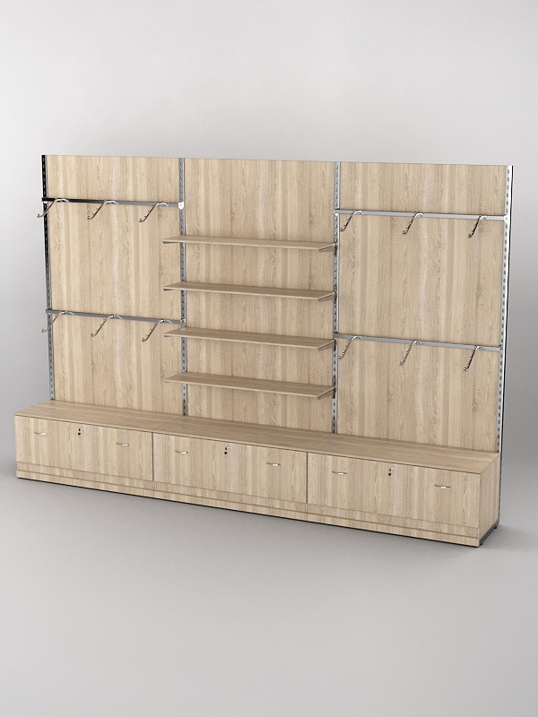 Система «Элегант» — представляет собой стальные перфорированные L-образные стойки длиной 2400мм, сечением трубы 38х38мм с фурнитурой. Стойки скрепляются между собой через определенные расстояния металлическими стяжками. Специализированная фурнитура представляет собой крючки, кронштейны, поручни и полкодержатели, которые вставляются в пазы стоек. Высота и ширина текущей конструкции может быть уменьшена, либо увеличена по желанию заказчика. Также возможен вариант размещения зеркальных или ЛДСП панелей, или экономпанелей между стойками, что позволит придать помещению эксклюзивный вид.