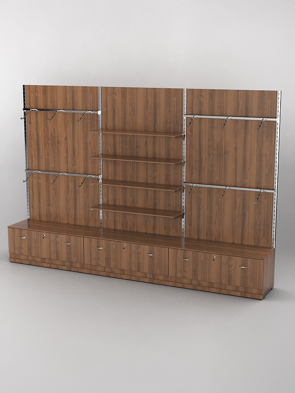 Система «Элегант» — представляет собой стальные перфорированные L-образные стойки длиной 2400мм, сечением трубы 38х38мм с фурнитурой. Стойки скрепляются между собой через определенные расстояния металлическими стяжками. Специализированная фурнитура представляет собой крючки, кронштейны, поручни и полкодержатели, которые вставляются в пазы стоек. Высота и ширина текущей конструкции может быть уменьшена, либо увеличена по желанию заказчика. Также возможен вариант размещения зеркальных или ЛДСП панелей, или экономпанелей между стойками, что позволит придать помещению эксклюзивный вид.
