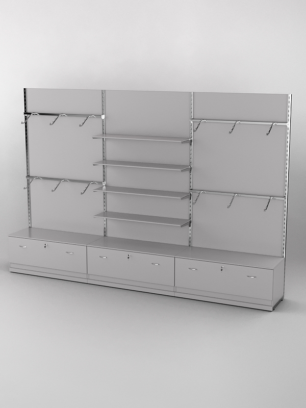 Система «Элегант» — представляет собой стальные перфорированные L-образные стойки длиной 2400мм, сечением трубы 38х38мм с фурнитурой. Стойки скрепляются между собой через определенные расстояния металлическими стяжками. Специализированная фурнитура представляет собой крючки, кронштейны, поручни и полкодержатели, которые вставляются в пазы стоек. Высота и ширина текущей конструкции может быть уменьшена, либо увеличена по желанию заказчика. Также возможен вариант размещения зеркальных или ЛДСП панелей, или экономпанелей между стойками, что позволит придать помещению эксклюзивный вид.