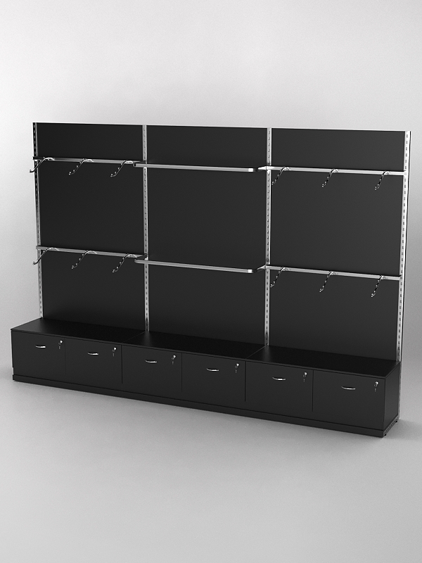 Система «Элегант» — представляет собой стальные перфорированные L-образные стойки длиной 2400мм, сечением трубы 38х38мм с фурнитурой. Стойки скрепляются между собой через определенные расстояния металлическими стяжками. Специализированная фурнитура представляет собой крючки, кронштейны, поручни и полкодержатели, которые вставляются в пазы стоек. Высота и ширина текущей конструкции может быть уменьшена, либо увеличена по желанию заказчика. Также возможен вариант размещения зеркальных или ЛДСП панелей, или экономпанелей между стойками, что позволит придать помещению эксклюзивный вид.
