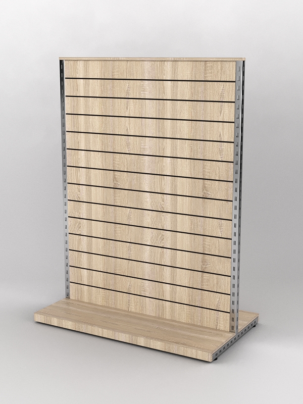 Островная система предназначена для демонстрации различных видов товаров. Конструкция состоит из Т-образных стоек, между которыми находится стенка из экономпанели. Основание конструкции выполнено из ДСП.