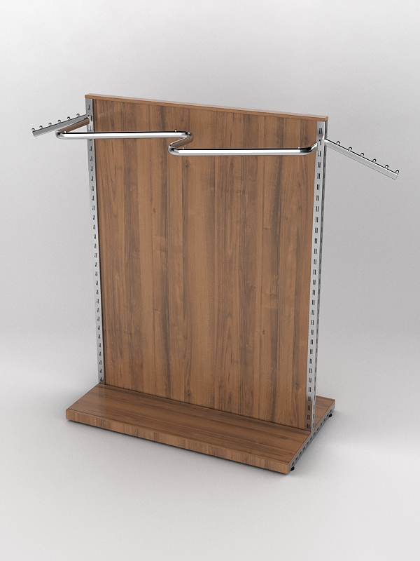 Каркас состоит из металлических перфорированных Т-образных стоек, между которыми находится стенка из ДСП. Основание конструкции также выполнено из ДСП. Наверху, с одной стороны от стенки расположена изогнутая штанга, с другой — три перекладины с крючками. На каждой перекладине восемь крючков. По бокам к системе крепятся кронштейны.