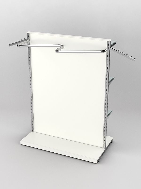 Каркас состоит из металлических перфорированных Т-образных стоек, между которыми находится стенка из ДСП. Основание конструкции также выполнено из ДСП. Наверху, с одной стороны от стенки расположена изогнутая штанга, с другой — три стеклянные полки. По бокам к системе крепятся кронштейны.