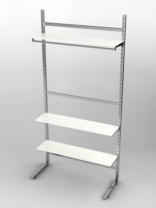 Система «Элегант» — представляет собой стальные перфорированные L-образные стойки длиной 2400мм, сечением трубы 38х38мм с фурнитурой. Стойки скрепляются между собой через определенные расстояния металлическими стяжками. Специализированная фурнитура представляет собой крючки, кронштейны, поручни и полкодержатели, которые вставляются в пазы стоек. Высота и ширина текущей конструкции может быть уменьшена, либо увеличена по желанию заказчика. Также возможен вариант размещения зеркальных или ЛДСП панелей, или экономпанелей между стойками, что позволит придать помещению эксклюзивный вид.
