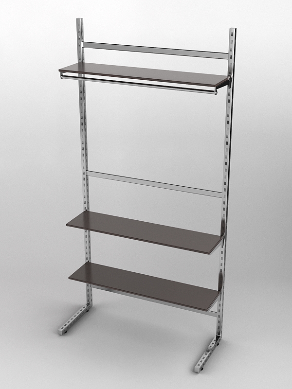 Система «Элегант» — представляет собой стальные перфорированные L-образные стойки длиной 2400мм, сечением трубы 38х38мм с фурнитурой. Стойки скрепляются между собой через определенные расстояния металлическими стяжками. Специализированная фурнитура представляет собой крючки, кронштейны, поручни и полкодержатели, которые вставляются в пазы стоек. Высота и ширина текущей конструкции может быть уменьшена, либо увеличена по желанию заказчика. Также возможен вариант размещения зеркальных или ЛДСП панелей, или экономпанелей между стойками, что позволит придать помещению эксклюзивный вид.