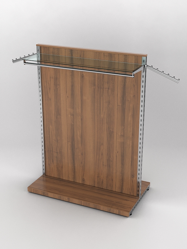 Каркас состоит из металлических перфорированных Т-образных стоек, между которыми находится стенка из ДСП. Основание конструкции также выполнено из ДСП. Наверху, с одной стороны от стенки, расположена стеклянная полка со штангой, с другой — три перекладины с крючками. На каждой перекладине восемь крючков. По бокам к системе крепятся кронштейны.