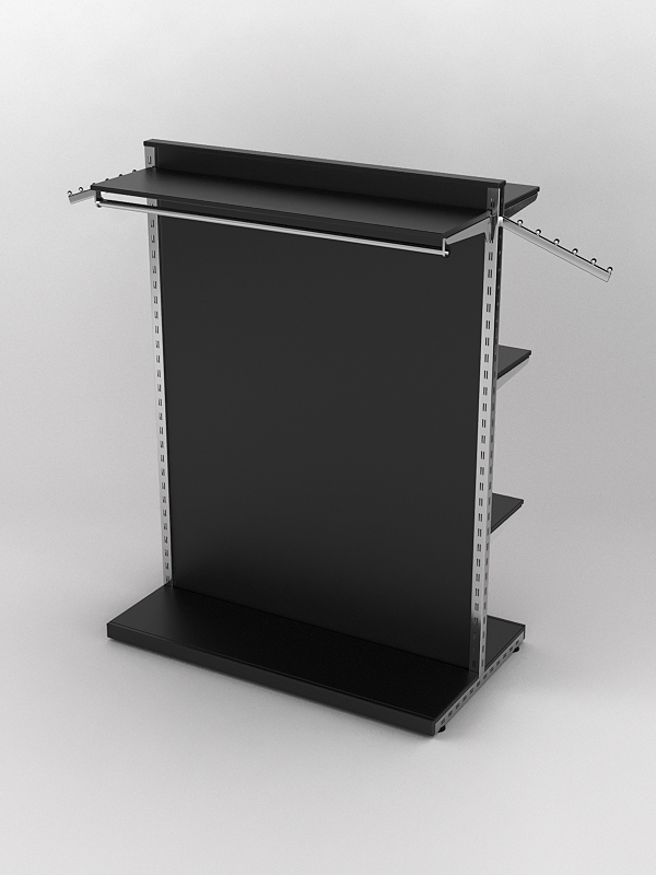 Каркас состоит из металлических перфорированных Т-образных стоек, между которыми находится стенка из ДСП. Основание конструкции также выполнено из ДСП. Наверху, с обеих сторон от стенки расположены полки из ДСП. Одна из полок оборудована штангой. По бокам к системе крепятся кронштейны.