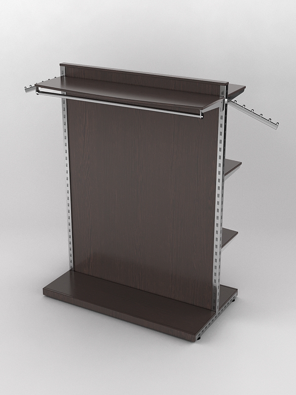 Каркас состоит из металлических перфорированных Т-образных стоек, между которыми находится стенка из ДСП. Основание конструкции также выполнено из ДСП. Наверху, с обеих сторон от стенки, располагаются полукруглые полки из ДСП. Одна из полок оборудована штангой. По бокам к системе крепятся кронштейны.