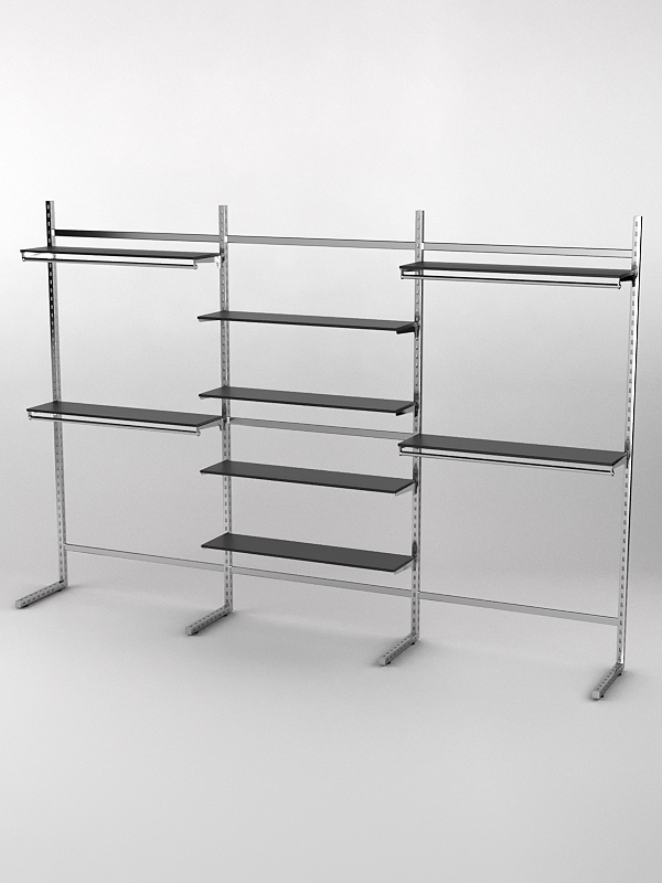 Система «Элегант» — представляет собой стальные перфорированные L-образные стойки длиной 2400мм, сечением трубы 38х38мм с фурнитурой. Стойки скрепляются между собой через определенные расстояния металлическими стяжками. Специализированная фурнитура представляет собой крючки, кронштейны, поручни и полкодержатели, которые вставляются в пазы стоек. Высота и ширина текущей конструкции может быть уменьшена, либо увеличена по желанию заказчика. Также возможен вариант размещения зеркальных или ЛДСП панелей, или экономпанелей между стойками, что позволит придать помещению эксклюзивный вид.