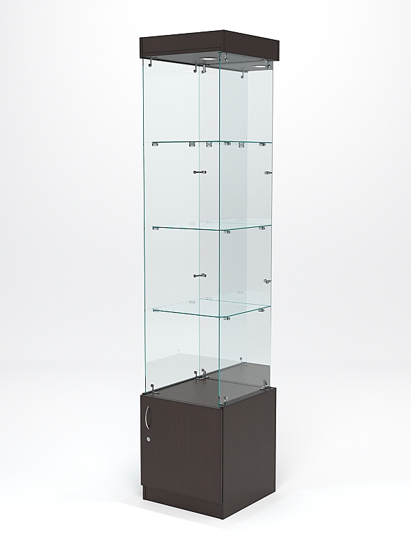 В верхней части оснащена подсветка. Подсветка в стеклянной витрине используется для привлечения внимания потенциальных покупателей к товарам, которые находятся внутри. Она также помогает улучшить видимость товаров и создаёт уютную атмосферу в магазине.