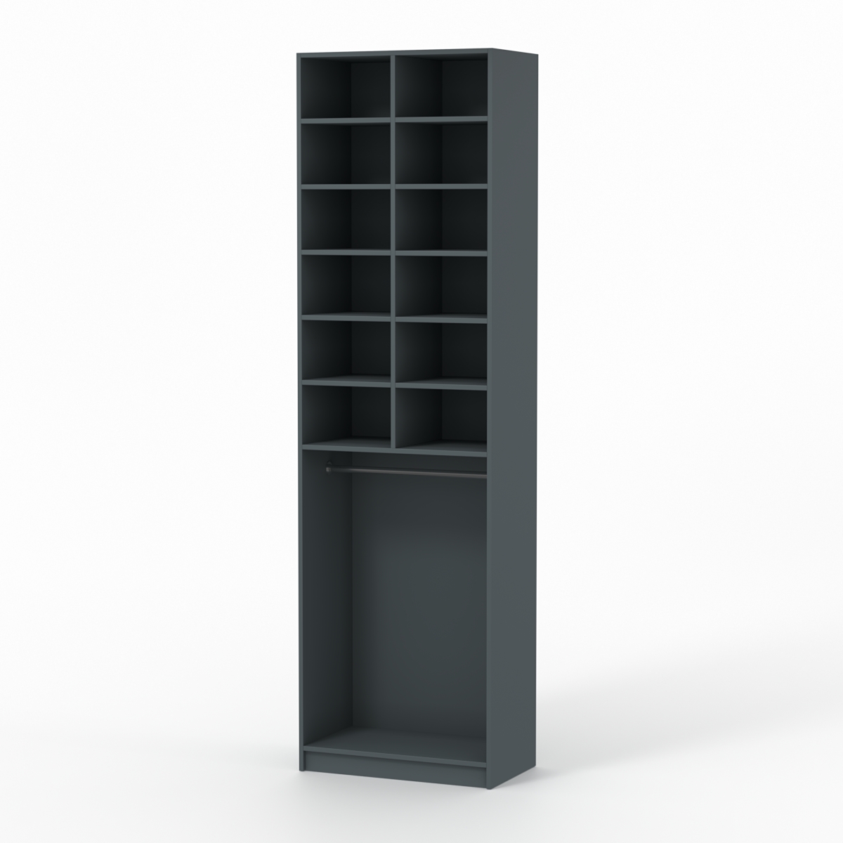 Стенд имеет две рабочие зоны. В верхней зоне находится 12 секций для хранения упакованных сорочек. Нижняя зона оборудована штангой для размещения одежды на плечиках.