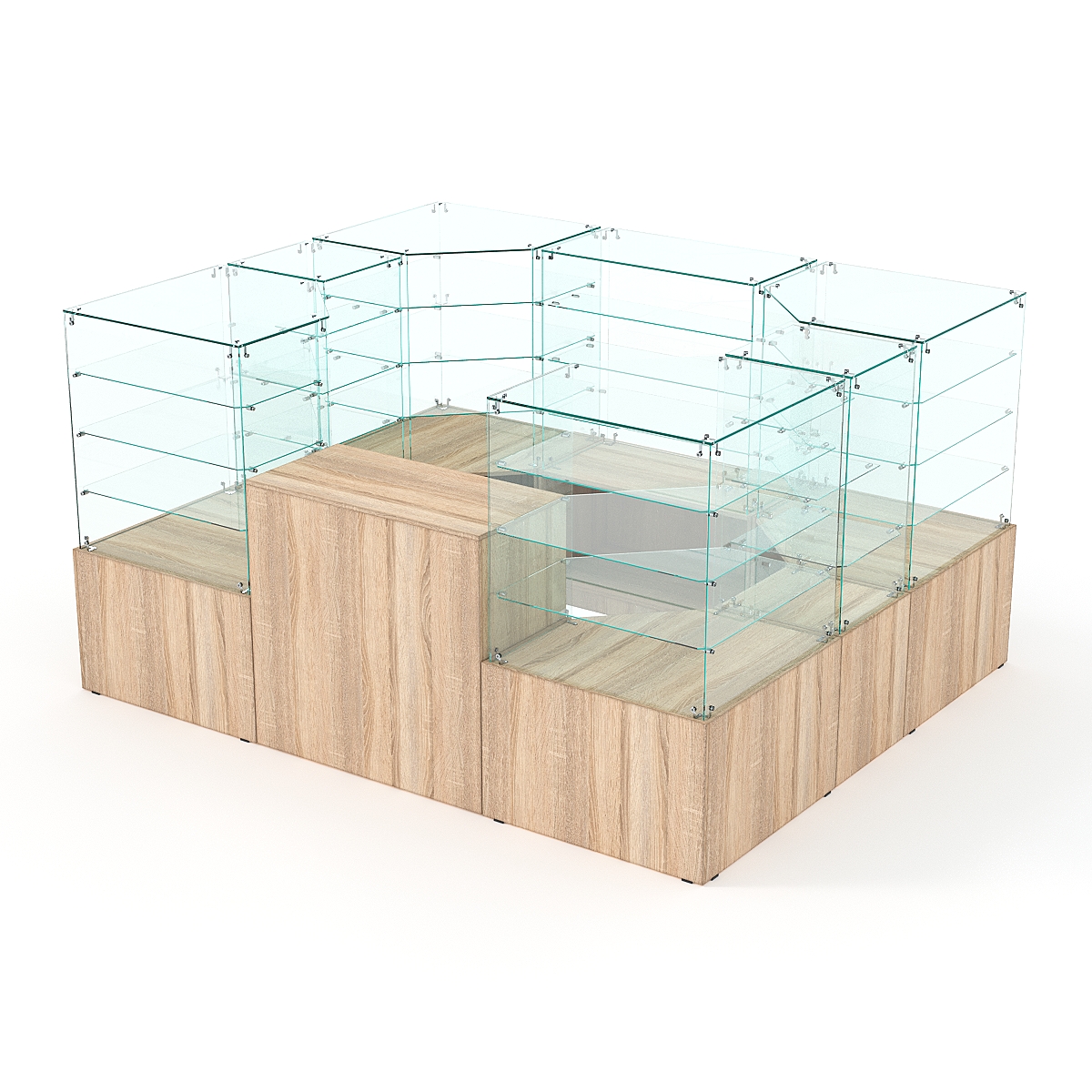 Павильон предназначен для расположения в центре зала, имеет прямоугольную форму и просматривается с 4-х сторон. Со стороны продавца витрины закрытые. Чаще всего используют в торговых центрах.