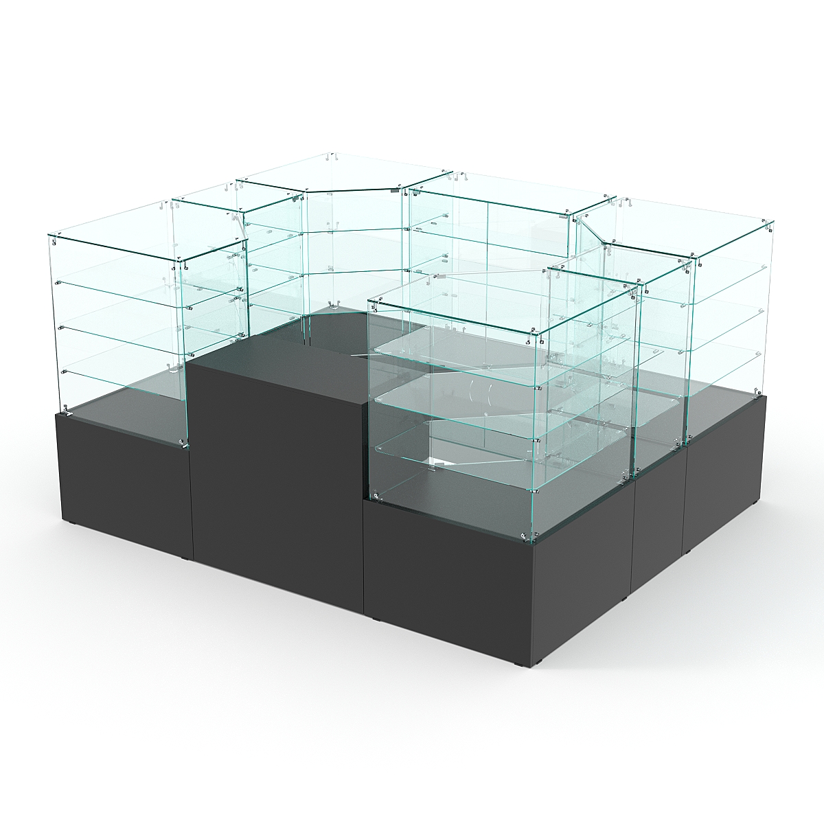 Павильон предназначен для расположения в центре зала, имеет прямоугольную форму и просматривается с 4-х сторон. Со стороны продавца витрины открытые. Чаще всего используют в торговых центрах.