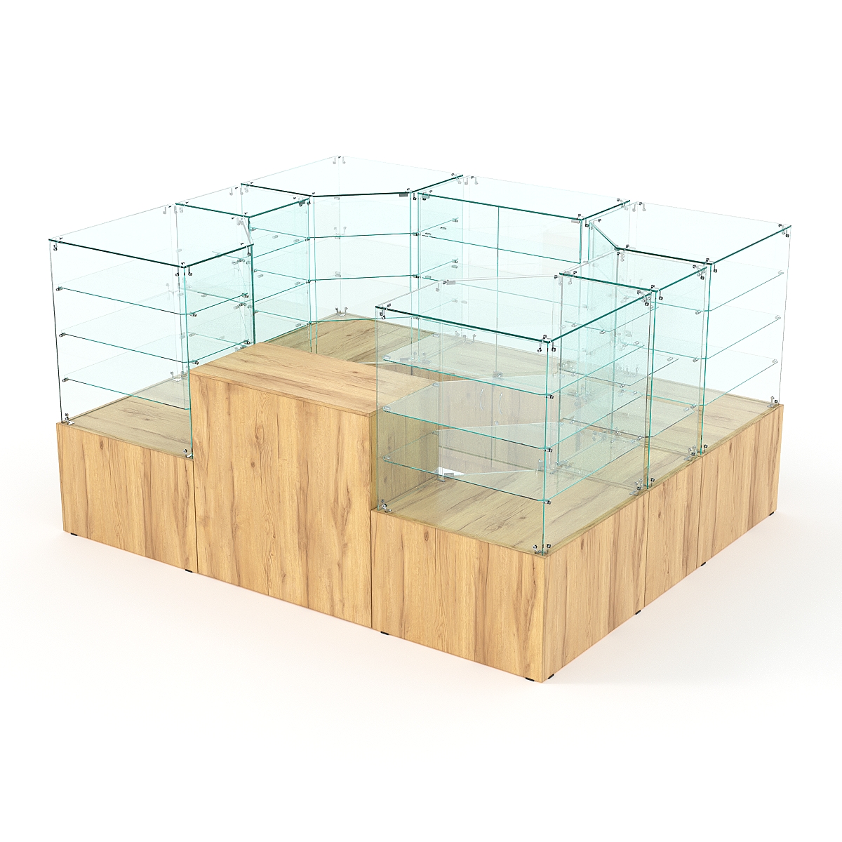 Павильон предназначен для расположения в центре зала, имеет прямоугольную форму и просматривается с 4-х сторон. Со стороны продавца витрины открытые. Чаще всего используют в торговых центрах.